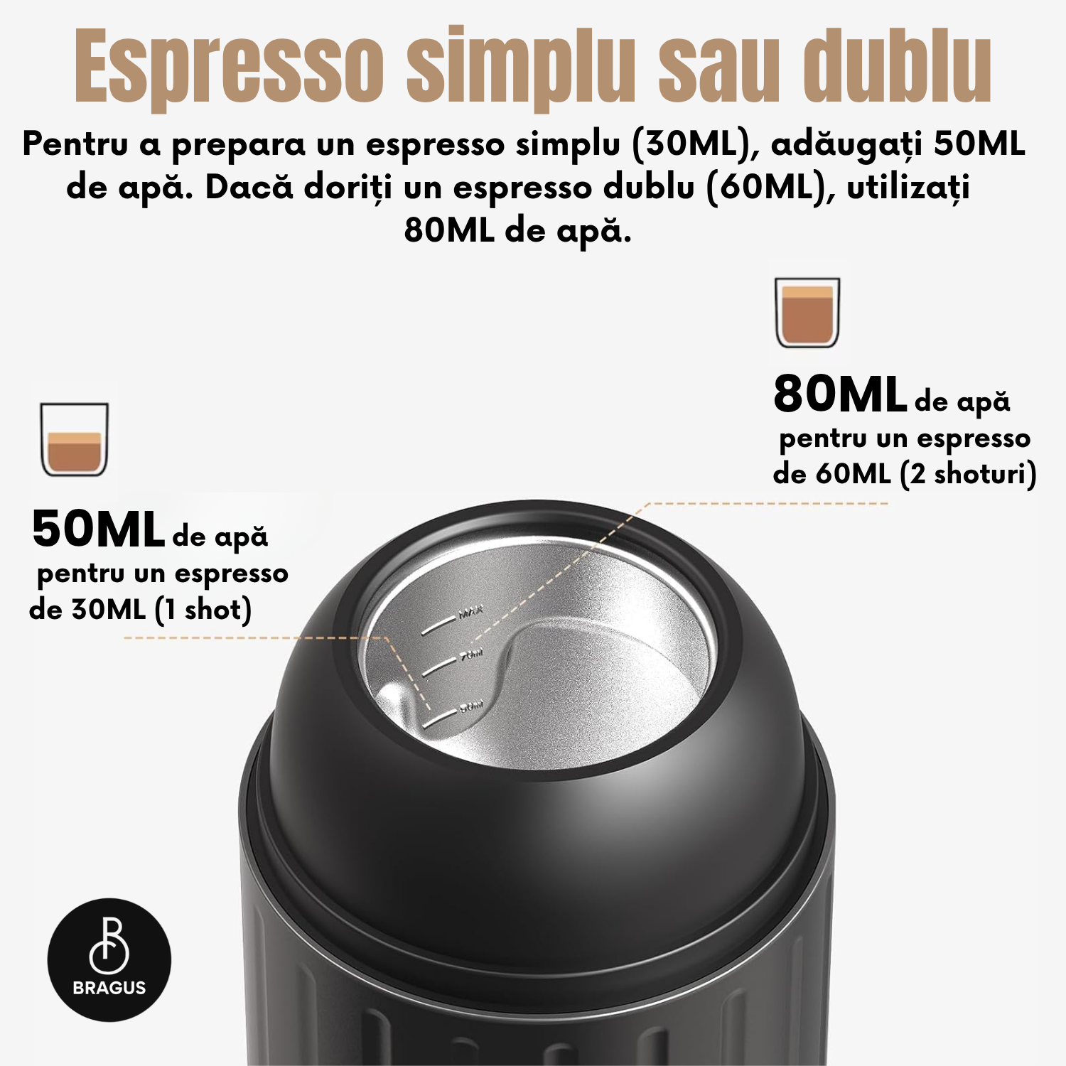 „Indiferent unde te afli — la birou, în mașină sau în natură — espressorul Bragus îți oferă libertatea unei cafele perfecte oricând. Bateria puternică și funcția de încălzire integrată asigură o experiență completă, fără prize sau accesorii suplimentare. Bucură-te de aroma intensă a cafelei tale preferate, exact așa cum îți place, oriunde și oricând.