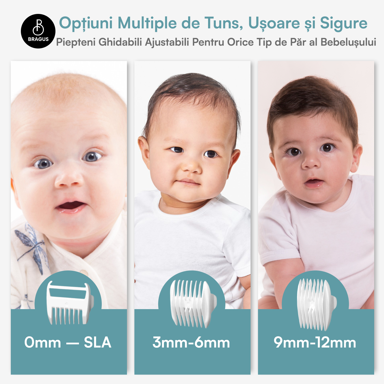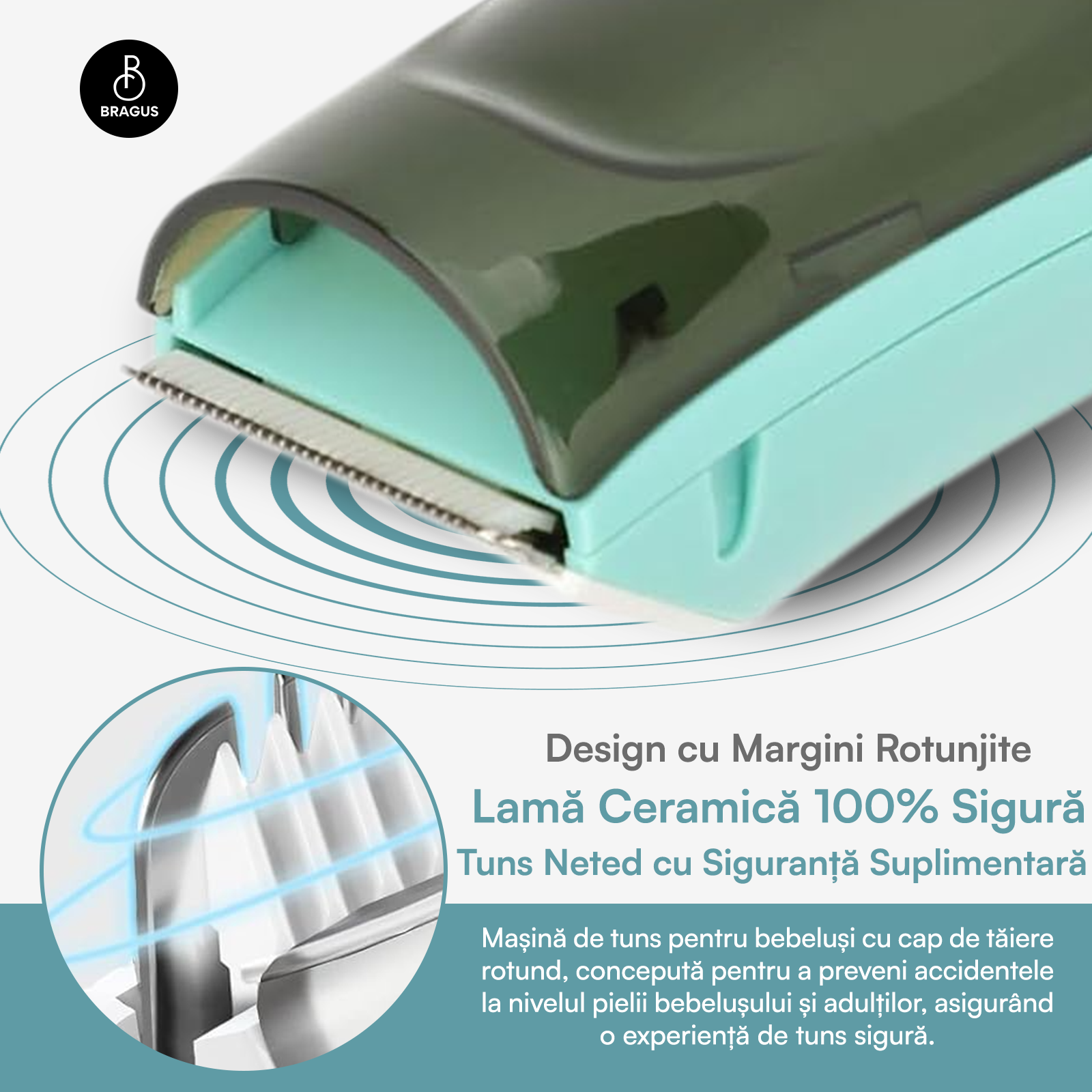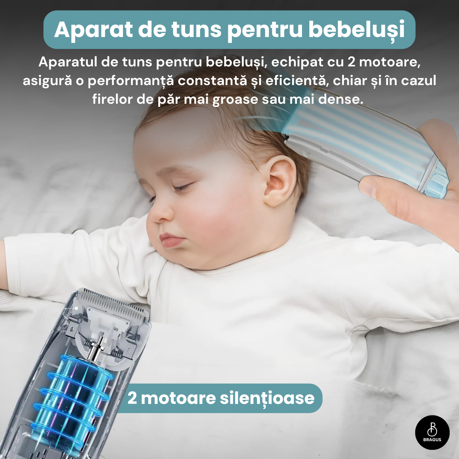 Aparat de Tuns pentru Bebelusi, Copii si Adulti, BRAGUS, 600mAh, 2 Trepte de Viteza, 2 Motoare Silentioase, Functie de Aspirare a Parului, Rezistent la Apa IPX7, Reincarcabil USB, 3 Piepteni Inclusi