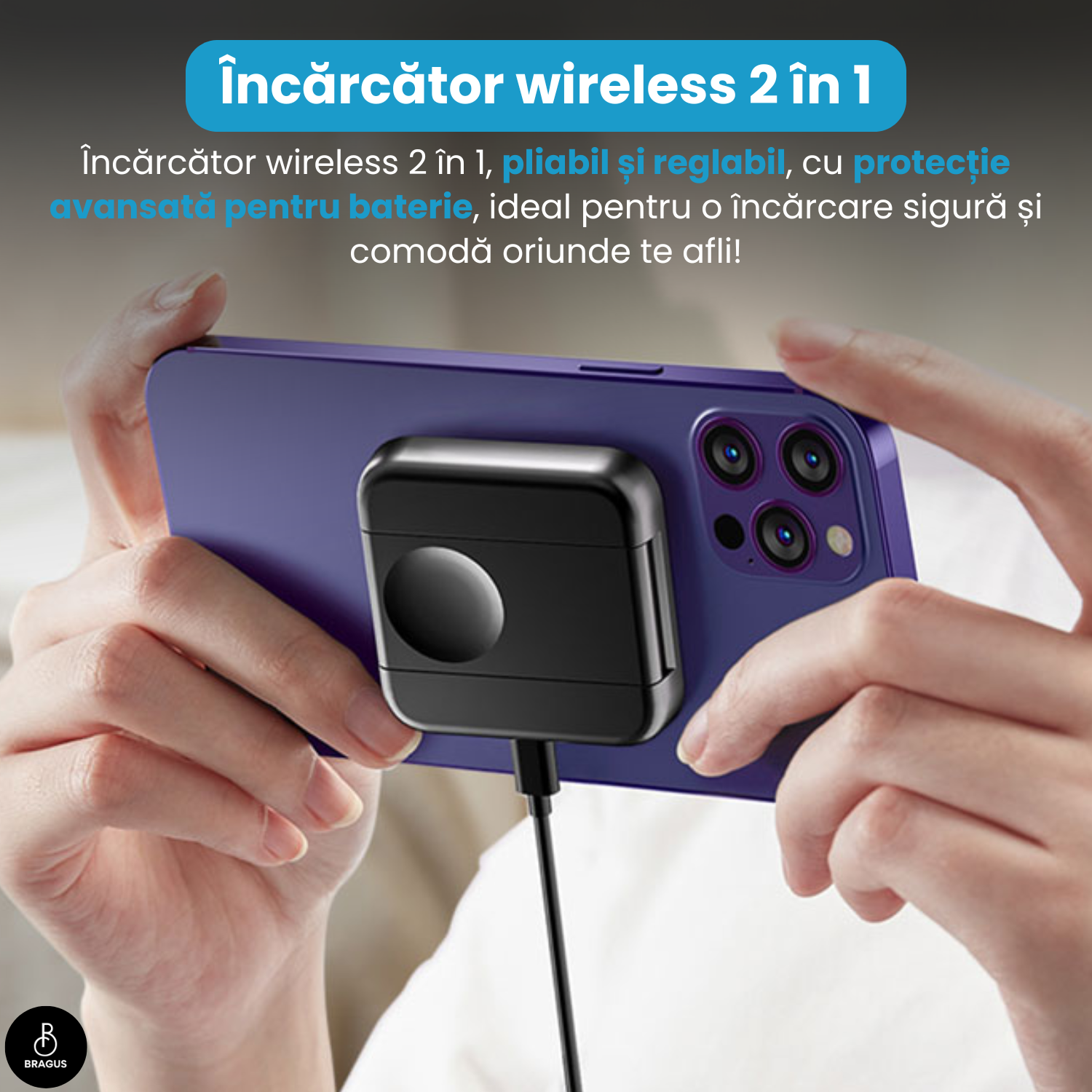 Incarcator Wireless 2 in 1, Incarcare Simultana 2 Dispozitive, Pliabil, Tehnologie MagSafe, Incarcare Duala, Magnet Puternic, Suport pentru Telefon, Compatibil iPhone, Apple Watch, AirPods, Negru
