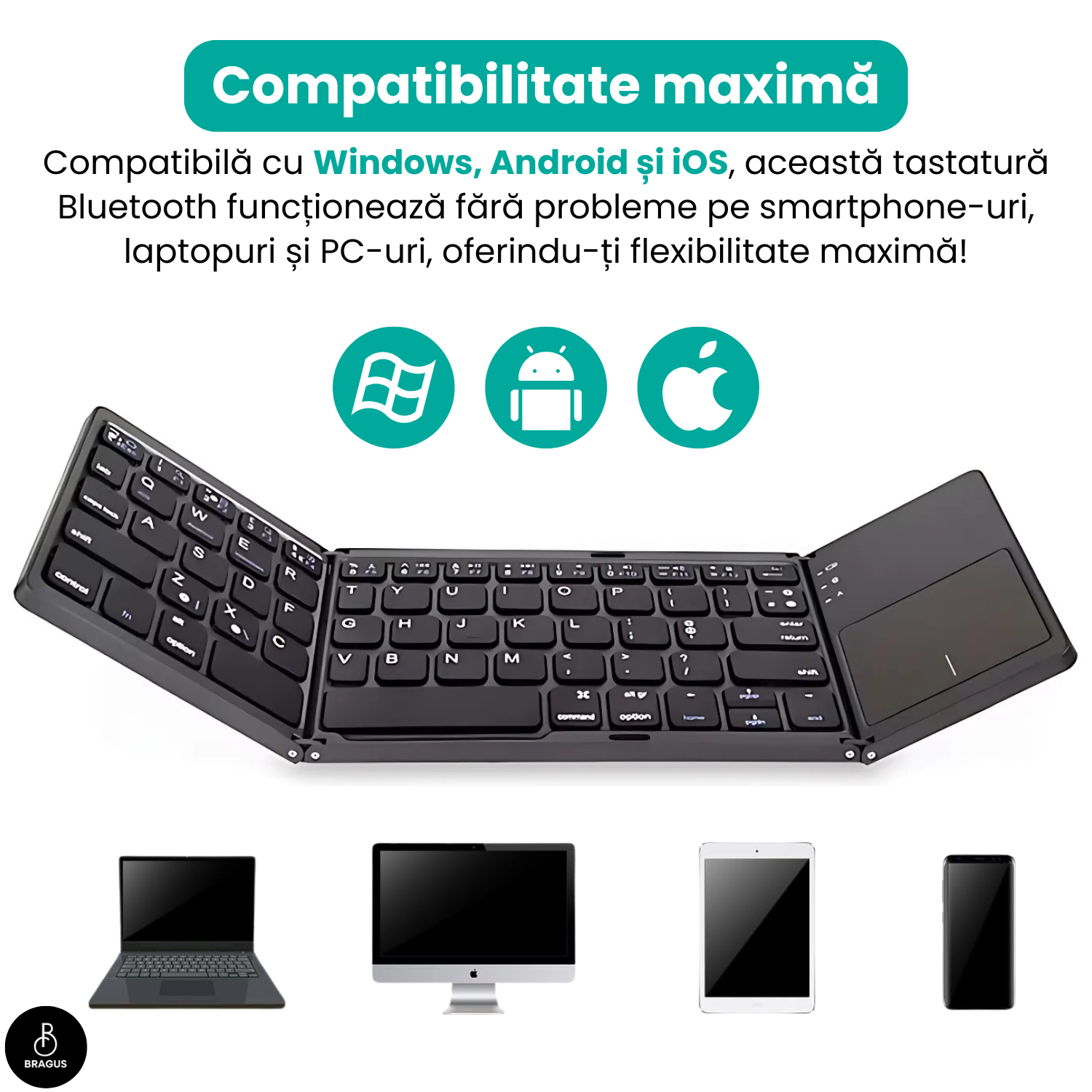 BRAGUS Tastatura Wireless Pliabila, Ultra Subtire, Portabila, Reincarcabila USB-C, Touch Pad cu 2 click- uri, Pliabila in 3 sectiuni, Bluetooth 5.0, Compatibila Android, iOS, Smart TV, Tableta, PC, 200g