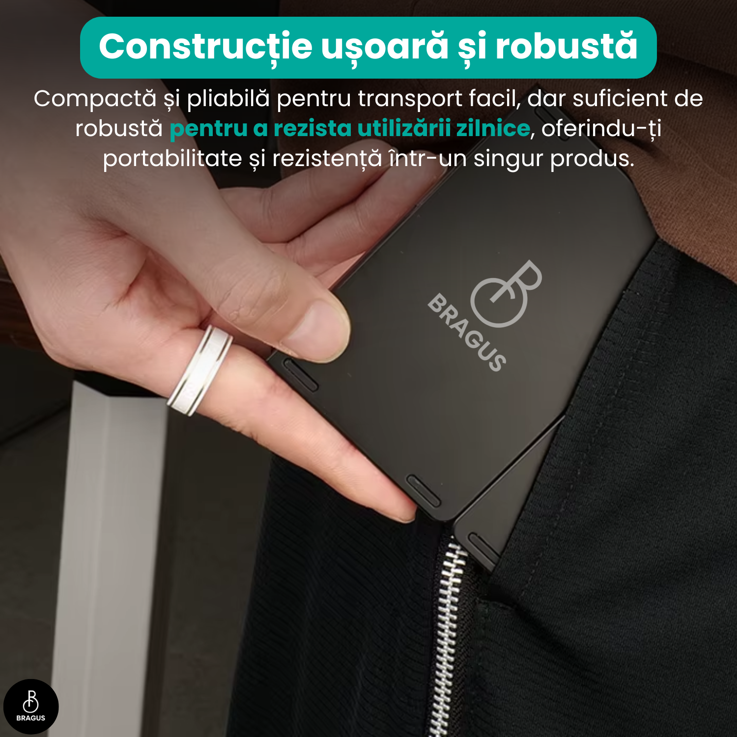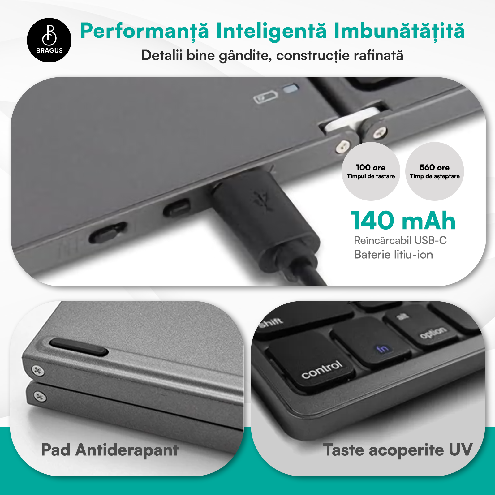 Designul pliabil în 3 secțiuni subțiri face din această tastatură wireless pliabilă Bragus un accesoriu extrem de practic și ușor de transportat. Balamalele metalice durabile oferă rezistență sporită și stabilitate în timpul utilizării zilnice. Tastatura pliabilă se pliază rapid într-un format compact, ideal pentru geantă, rucsac sau bagaj de mână. Construcția solidă asigură o experiență de tastare confortabilă chiar și atunci când este utilizată pe suprafețe diferite. Această tastatură Bluetooth pliabilă este concepută pentru utilizare frecventă, fără compromisuri la durabilitate. Designul inteligent combină portabilitatea cu fiabilitatea pe termen lung.
