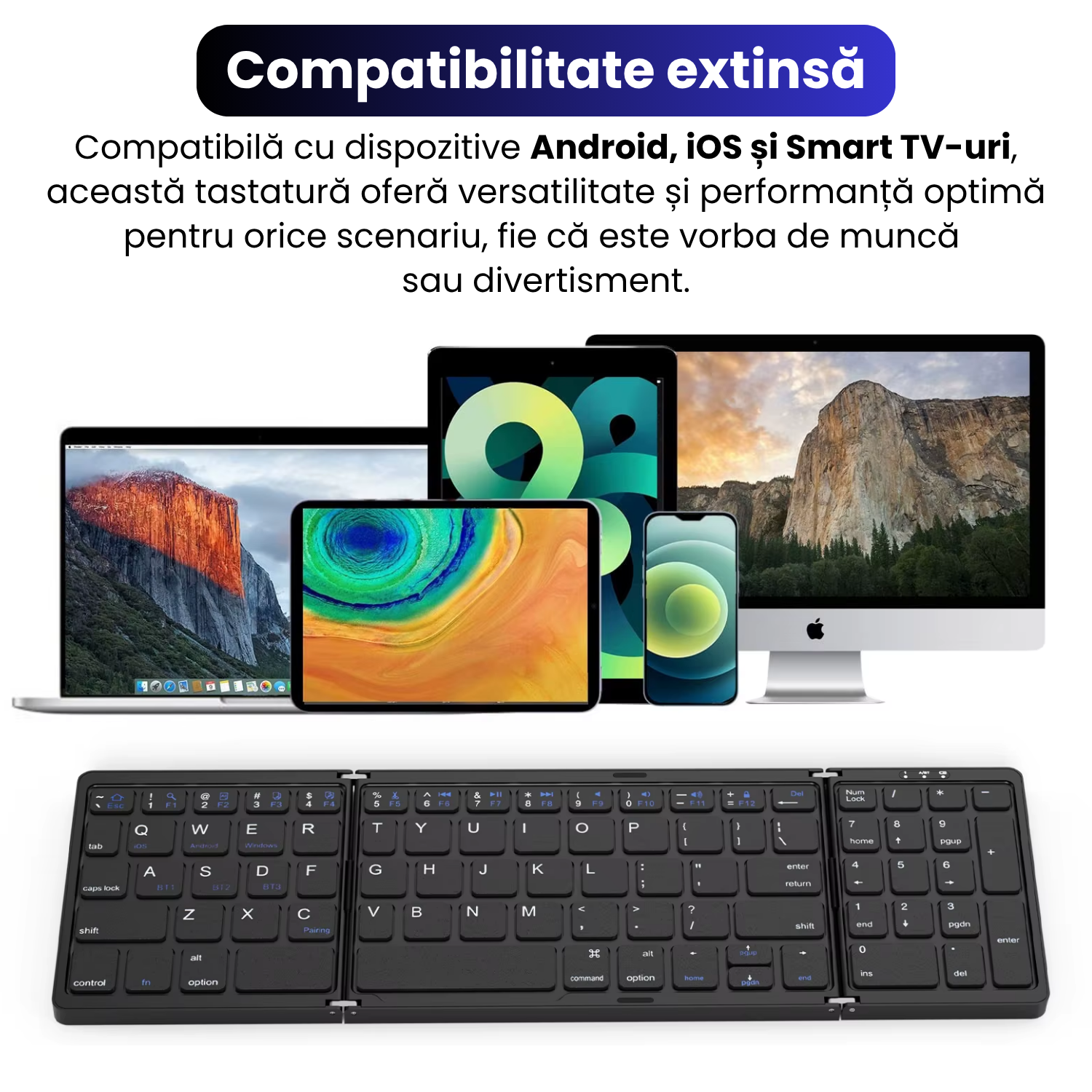 Cu un design inovativ pliabil in 3 sectiuni, aceasta tastatura compacta se pliaza rapid si usor, economisind spatiu si fiind ideala pentru transport. Fie ca o ascunzi in geanta, rucsac sau chiar in buzunar, o poti lua cu tine oriunde. Confortabila si eficienta, aceasta tastatura ofera o experienta de tastare excelenta, chiar si atunci cand esti pe drum sau intr-o locatie diferita. Designul sau elegant si practic te ajuta sa ramai productiv in orice situatie, iar portabilitatea ei face ca fiecare activitate sa devina mai usoara.